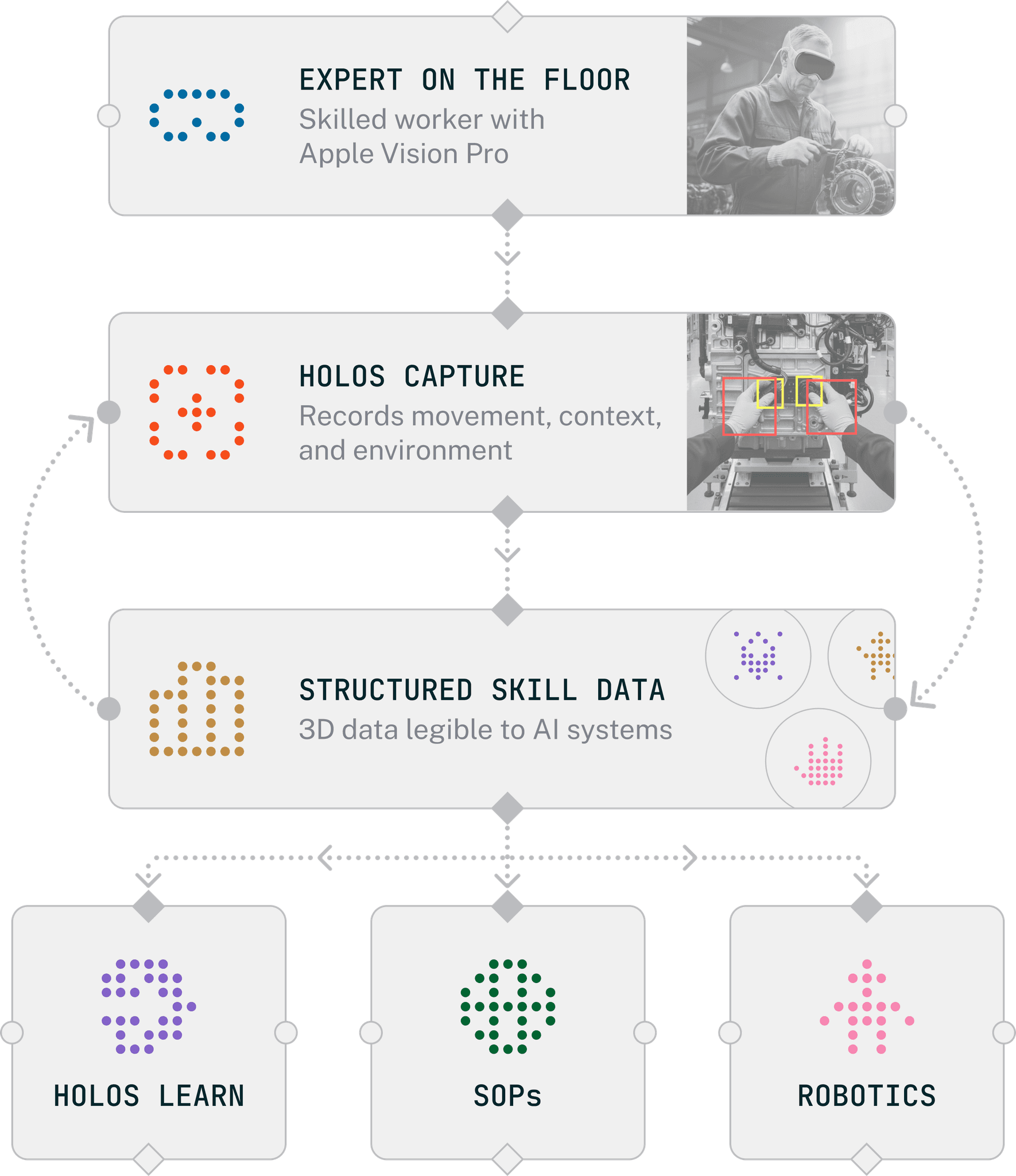 Holos Capture is the fastest way to capture and scale expert performance data for humanoid and collaborative robots. Using the Apple Vision Pro, instructors can demonstrate tasks naturally, whether assembling a part, performing a maintenance procedure, or executing complex motion.